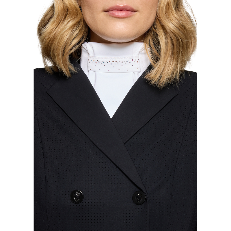 Made from a lightweight and comfortable fabric, it ensures a perfect fit while remaining comfortable under your show jacket. The crystal-effect details bring an elegant and sophisticated finish, ideal for standing out in the ring.