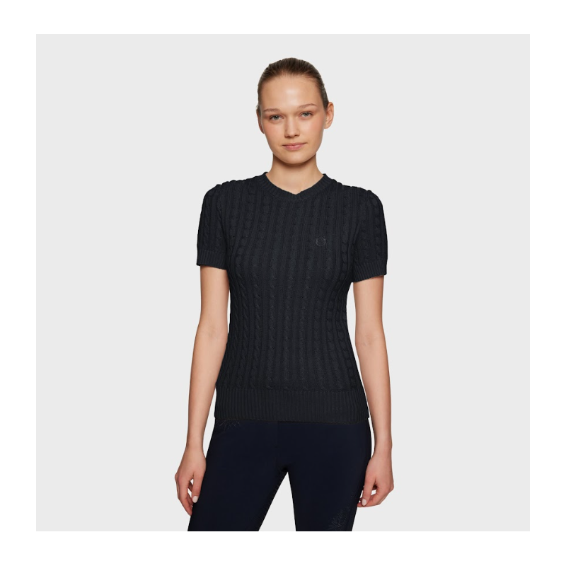 Pull-over à manches courtes pour femme Lidy Design raffiné et à motif tricots torsadés, col rond et blason Samshield brodé avec détails Swarovski® sur le torse Idéal pour les tenues décontractées alliant confort et élégance avec une coupe flatteuse intemporelle Lavable en machine et 100% coton