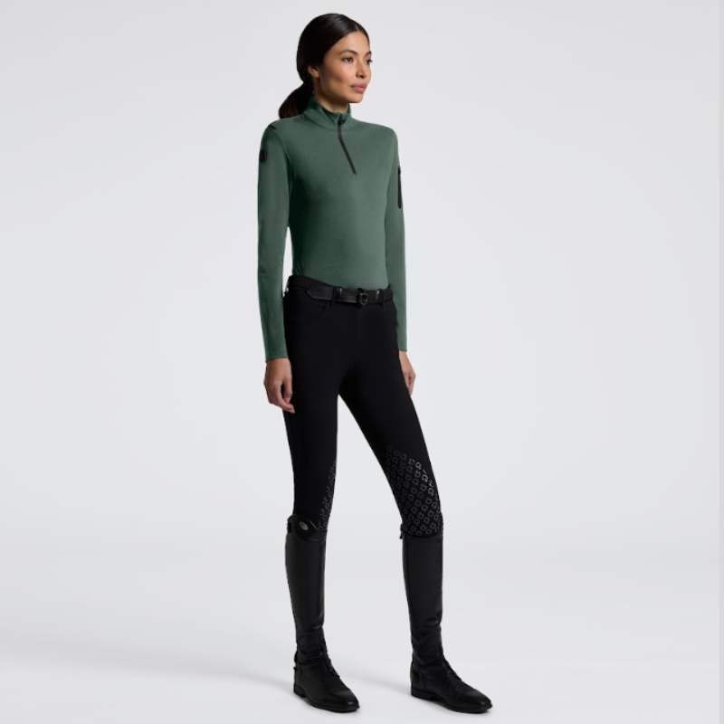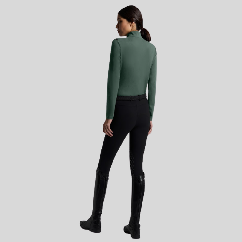 Le polo d’entraînement Cavalleria Toscana pour femme, à manches longues et col montant, est conçu pour offrir confort thermique et liberté de mouvement lors des séances d’équitation ou des activités en extérieur. Le jersey technique doublé polaire assure une isolation légère et respirante, tandis que la demi-fermeture zippée et le col montant protègent efficacement du vent sans compromettre le style.