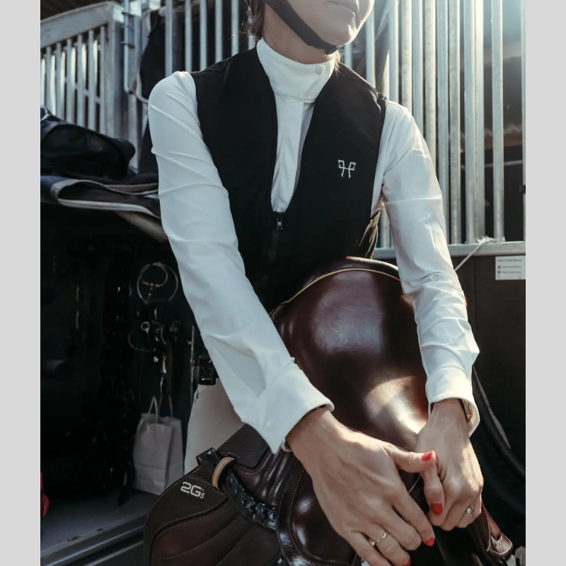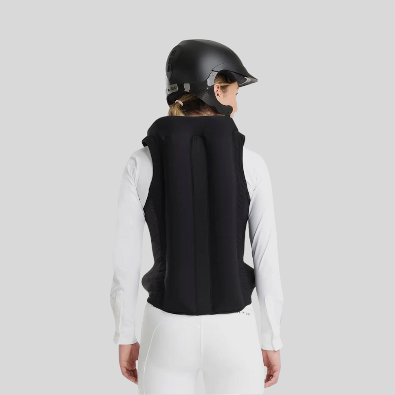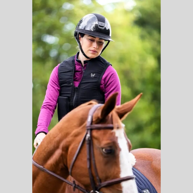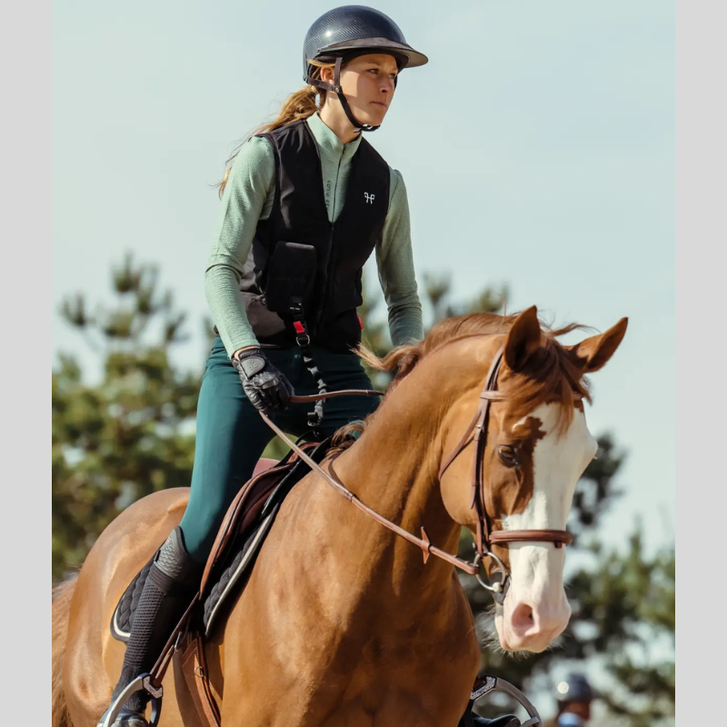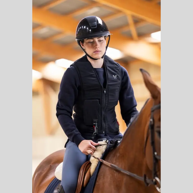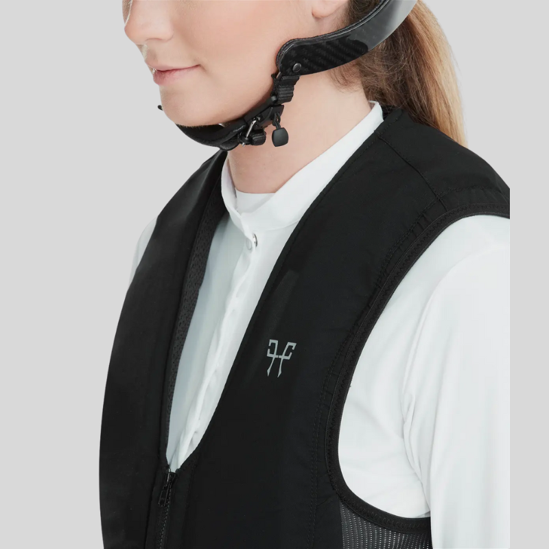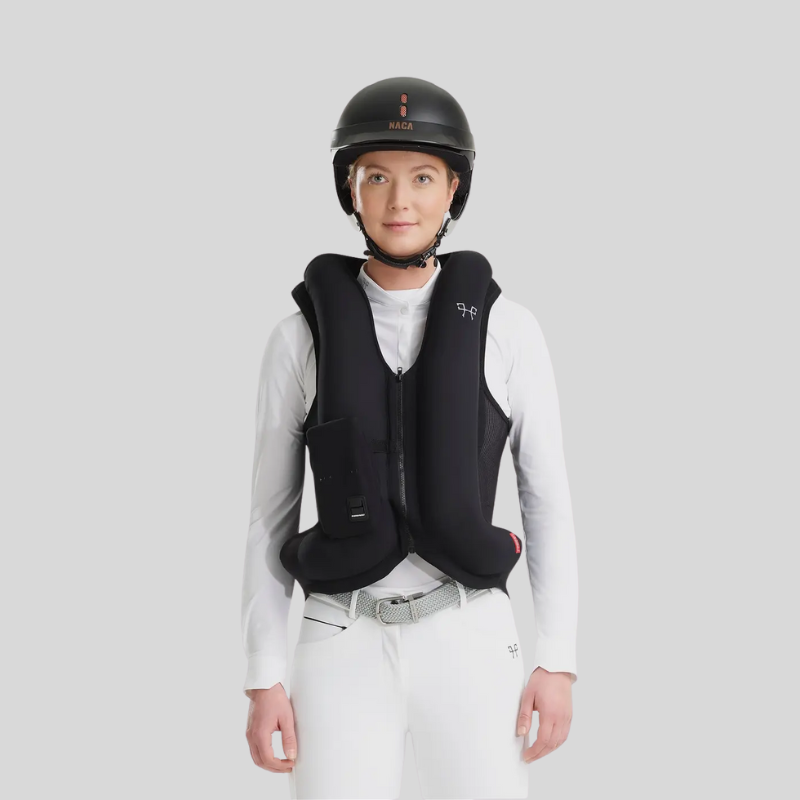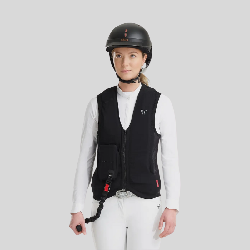 L’ergonomie et la matière bi-stretch du gilet lui permettent de supporter le gonflement de l’airbag tout en restant léger. Le mesh positionné sur les côtes et dans le dos offre au cavalier la respirabilité nécessaire lors d’efforts intenses. Le câble qui relie le cavalier à sa selle est aimanté : il se connecte et se déconnecte à une seule main, pour permettre au cavalier de ne pas avoir à lâcher les rênes.