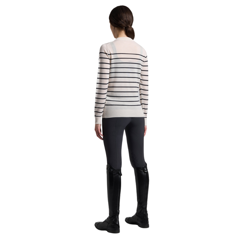Le tricot jacquard raffiné crée un motif à rayures horizontales subtilement intégré dans la maille, apportant relief et caractère au design. Doté d’un col rond classique et de poignets côtelés, il garantit une coupe confortable et soignée, idéale à porter seul ou en superposition. Le logo Cavalleria Toscana discrètement brodé sur la poitrine vient parfaire l’ensemble avec sobriété.