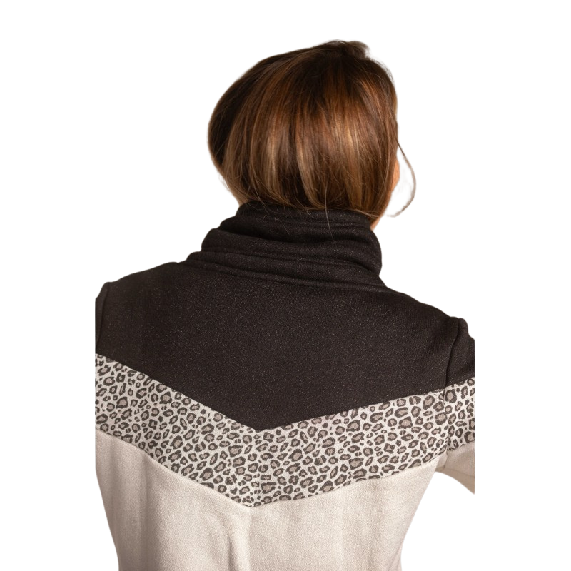 Sur l’empiècement léopard, le logo Pénélope est délicatement flocké en velours noir pour une finition raffinée et texturée. Le col montant est agrémenté de larges cordons discrets et intégrés, renforçant son allure moderne.