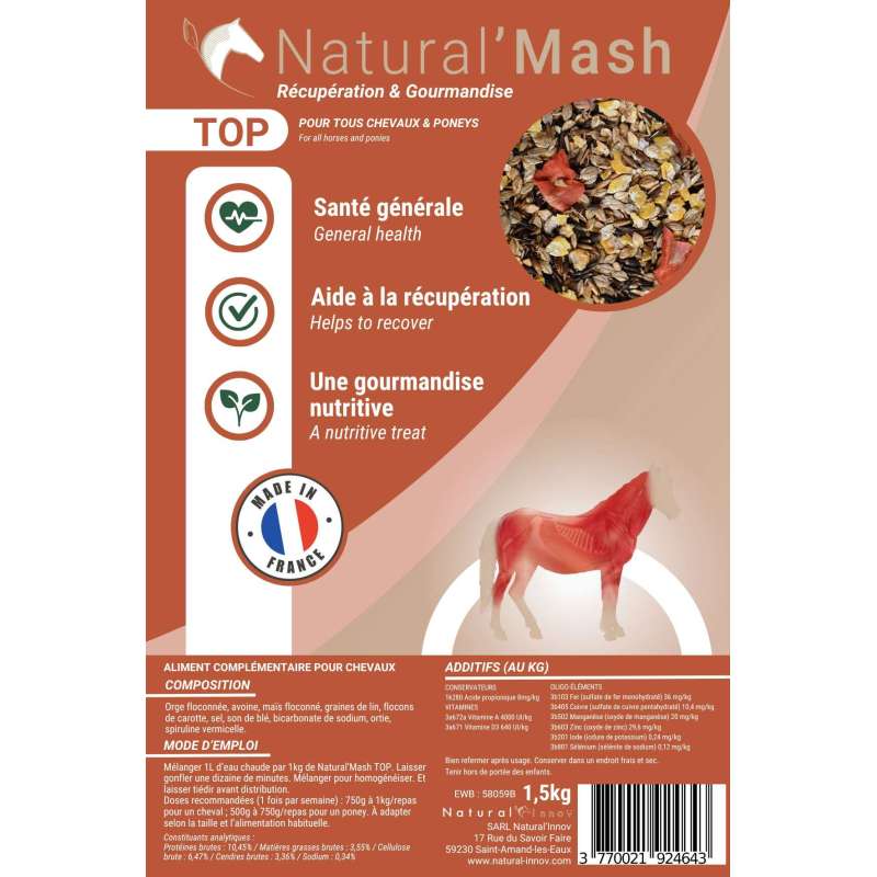 Natural’Mash est un mélange spécifique de céréales, lin, sel, bicarbonate de sodium, vitamines, oligoéléments pour contribuer à améliorer l’hydratation.