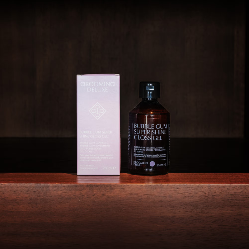 Laat de manen en staart van je paard stralen met de Grooming Deluxe Super Shine Gloss Gel Bubble Gum – de ultieme oplossing voor een onberispelijke showlook tijdens wedstrijden of speciale gelegenheden.