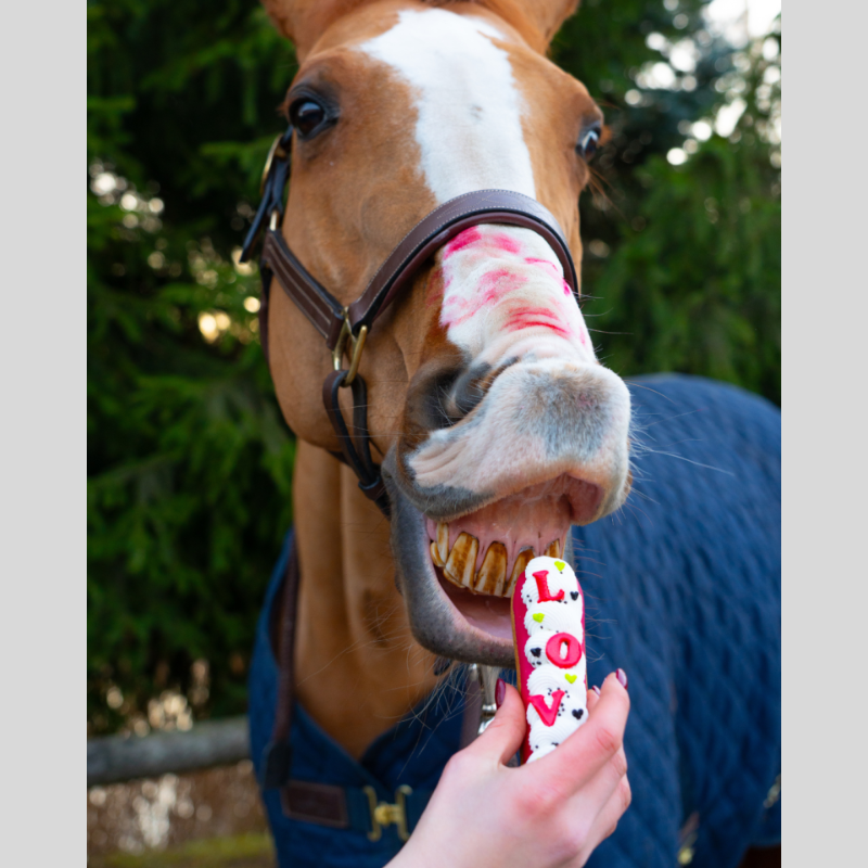 Deze éclair voor paarden, zorgvuldig met de hand gedecoreerd met royal icing, charmeert met zijn delicate uitstraling en pâtisserie-stijl. Ontworpen als een exclusieve seizoensgebonden traktatie is hij perfect om je paard een elegant verwenmoment te bieden of om een Valentijnsgeschenkbox aan te vullen.
