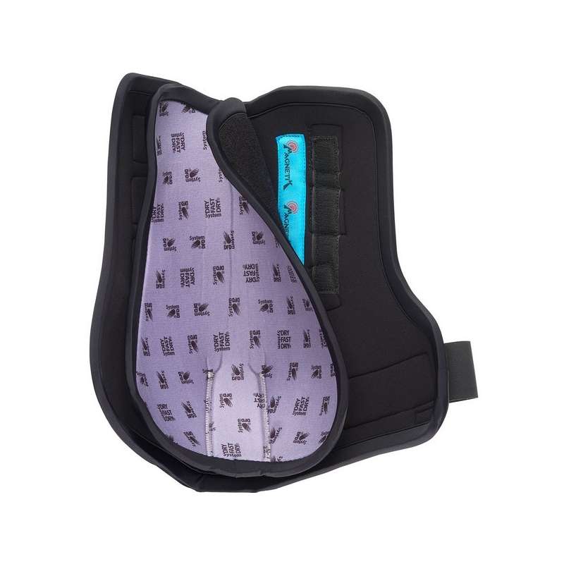 De binnenkant van de beenbeschermer is uitgerust met een verwisselbare voering van DFD (Dry Fast Dry®), veilig bevestigd met klittenband. Bovendien is het voorzien van 28 zorgvuldig gepositioneerde magneten langs de buigpezen en rond het kogelgewricht. Dit niet-invasieve en dopingvrije apparaat biedt een veilige en natuurlijke benadering om het welzijn van uw paard te bevorderen.