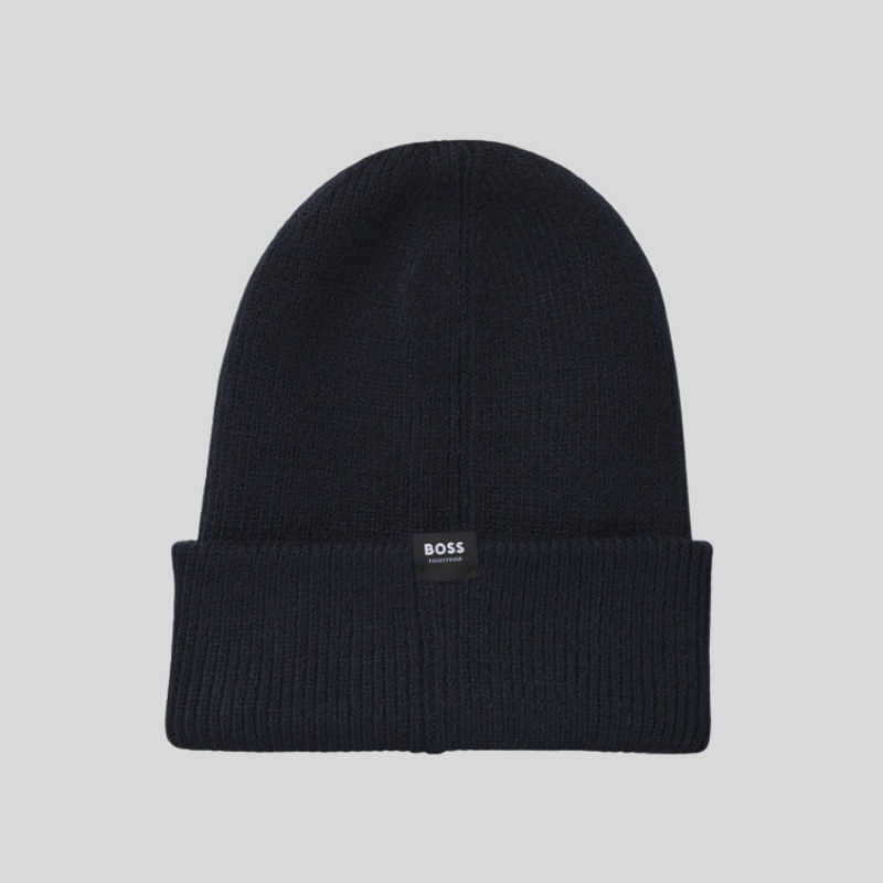 Deze BOSS muts van geribde breiwerkstof combineert gezellig comfort, moderne elegantie en duurzame materialen.