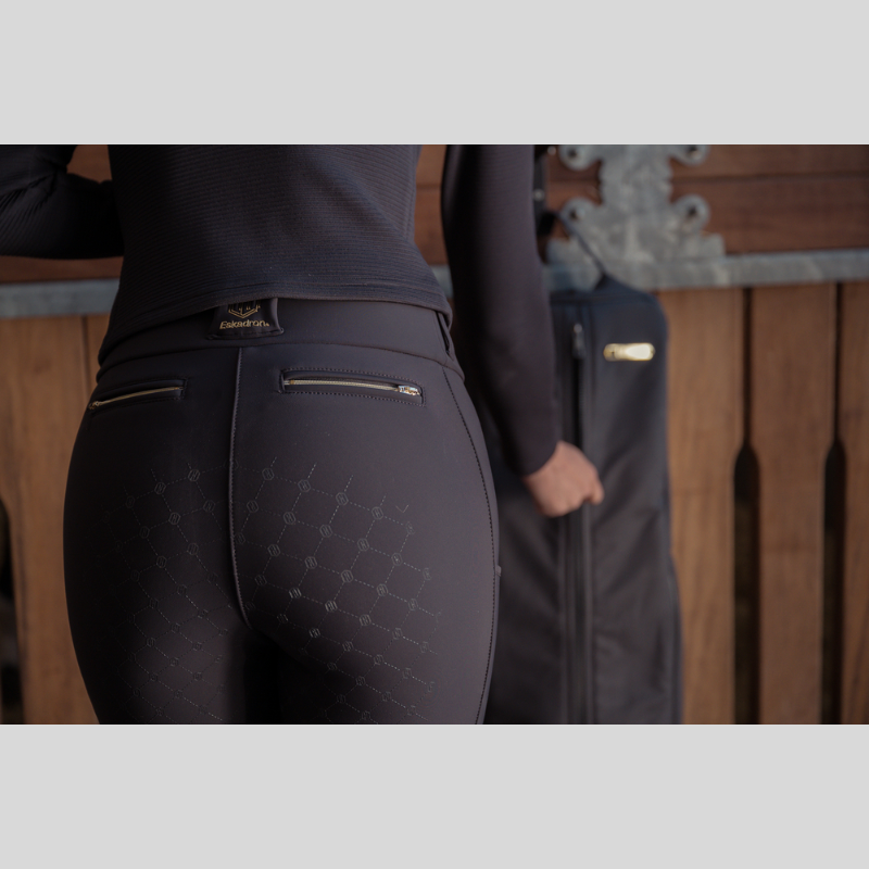 De licht geruwde binnenkant voelt zacht en warm aan op de huid. De decoratieve details met imitatiezakken en nep-ritsen geven de legging een moderne en elegante uitstraling. De telefoonzakken aan beide zijden maken hem bijzonder praktisch, zowel in als buiten het zadel. De brede, vormgevende tailleband, voorzien van riemlussen en een Heritage-embleem aan de achterzijde, zorgt voor perfecte ondersteuning en een verzorgde look.