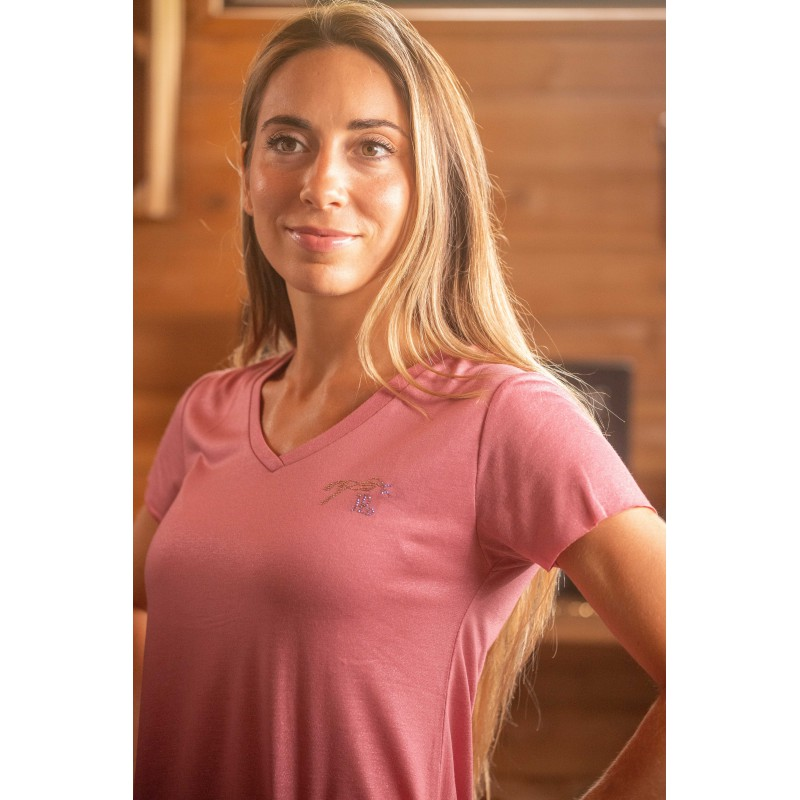 Het Pénélope “Juline” T-shirt verleidt met zijn elegante en tegelijk casual stijl. Het is vervaardigd uit een lichte stof met een subtiele iriserende glans en heeft korte mouwen en een flatterende V-hals, perfect voor een vrouwelijke look in het dagelijks leven. Het Pénélope-logo, verfijnd afgewerkt met strass op de borst, voegt een elegante sprankeling toe. Dankzij het soepele en comfortabele materiaal is het Juline T-shirt zowel geschikt voor het leven op stal als voor een stijlvolle outfit in de stad.