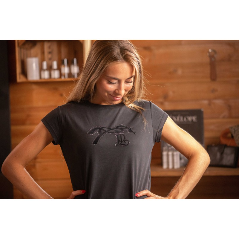 Het Pénélope Moby Stone T-shirt met korte mouwen valt op door zijn uitzonderlijke comfort en verfijnde uitstraling. Gemaakt van een ultra-zachte, lichte en soepele stof, voelt het aangenaam aan op de huid en biedt het optimale bewegingsvrijheid. Op de voorkant zorgt het Pénélope-logo in fluweelzachte flock, afgewerkt met strass, voor een elegante en subtiele glans. Dankzij zijn veelzijdige stijl is dit T-shirt perfect om te dragen tijdens het paardrijden, maar ook buiten de stallen, gecombineerd met een jeans voor een casual-chique look. De vloeiende, elastische stof past zich moeiteloos aan alle lichaamsvormen aan.
